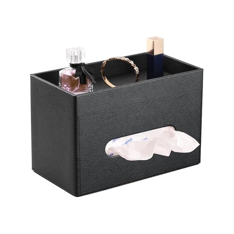 Rectangular Tissue Box Cover with Storage Tray, Leather Facial Tissue Box Holder for Bathroom, Office Table, Countertop, Night Stand & More (Black)