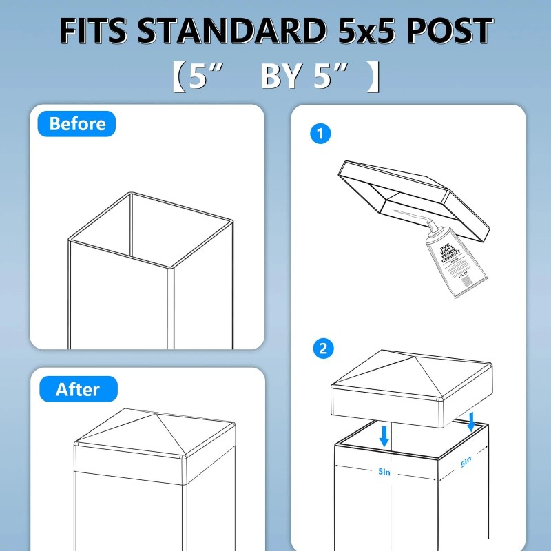 【Easy Installation】Installing these 5x5 vinyl fence post caps is a breeze. Simply slide the cap onto the post and secure with PVC glue. No screws or tools required, making it ideal for DIY projects or quick replacements.