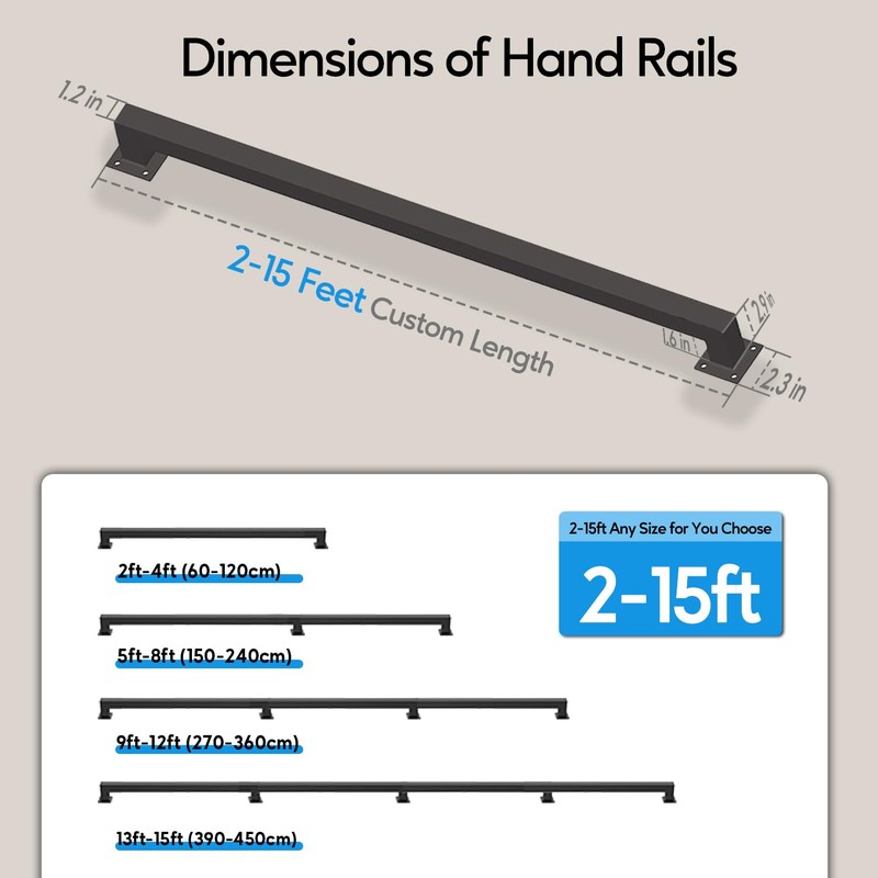 - 【Quick Installation】Install this modular square handrail by connecting sections with screws for custom lengths. Pre-drilled holes and included hardware make it easy to secure this railing for stairs to wood, brick, or concrete walls.