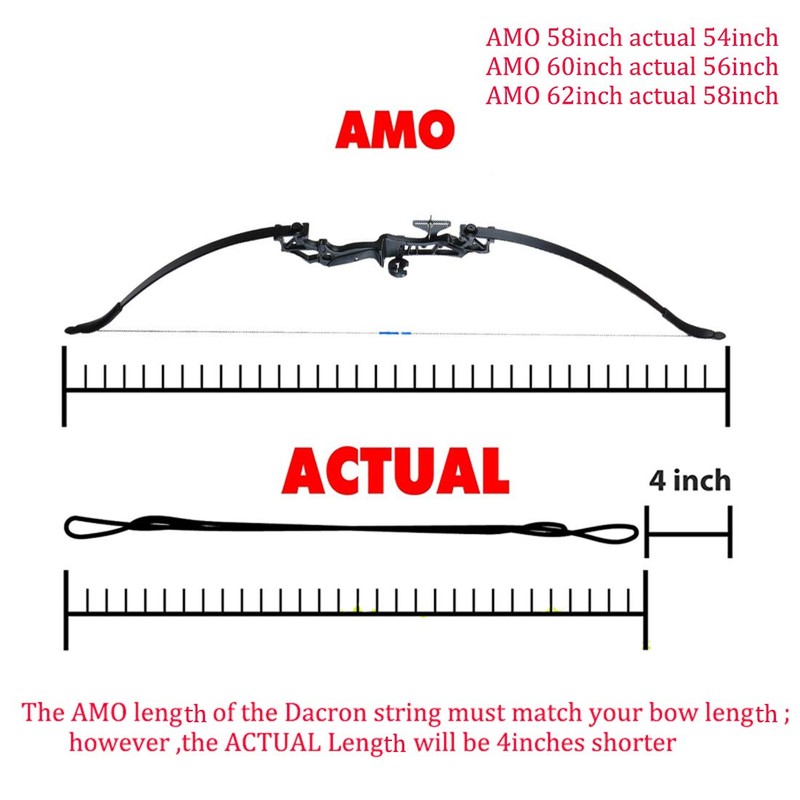 - Length Size & Strands Amount- Selecting your desired string length, keep in mind that the AMO" is the length of your BOW. The actual length is 4" shorter than the given Amo". The more powerful you shoot the more strands your string will need. 14 Strands for up to 50lbs bow16 Strands for up to 66lbs bow