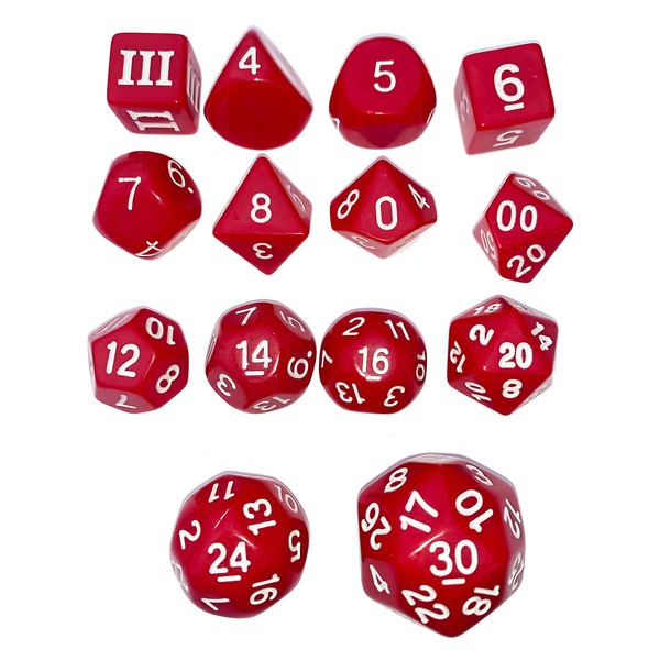 • 14 dice set. Includes the following dice D3, D4, D5, D6, D7, D8, D10, D%10, D12, D14, D16, D20, D24 and D30