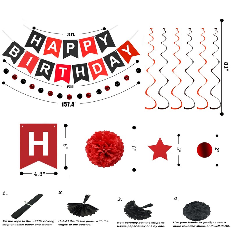 - Red and Black Birthday Decorations Set: Birthday Decorations Ornaments, includes 6 Pom Pom Papers + HAPPY BIRTHDAY Banner + 13.2 Feet red and black Circle Dot Garland + 6 Star Swirl Streamers, you can enjoy the perfect surprise party , No need to worry about running around and searching for individual items, we've got you covered.