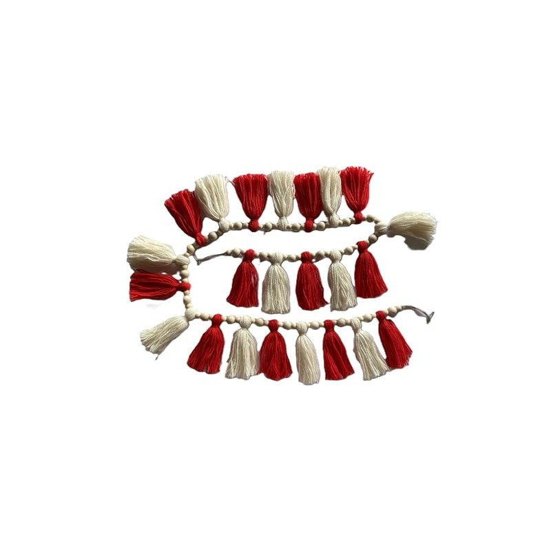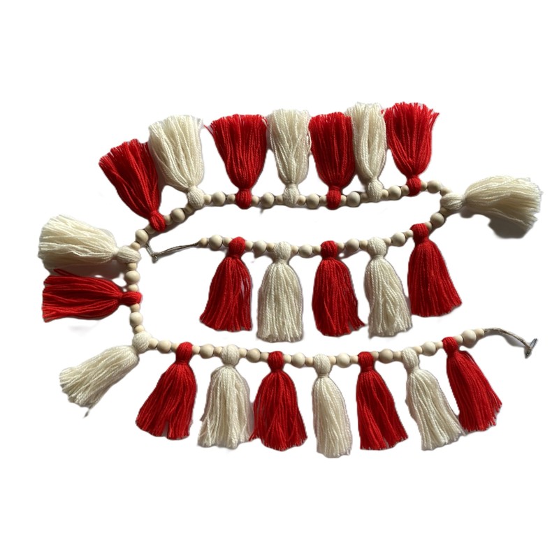 - Traditional Old Fashioned Style Christmas Mantel Garland in Winter White and Bright Red! Bright Red and Winter White 60" Tassel and Bead Garland - Wall Hanging Home Decor is made with 14 and 20mm natural wooden beads and handmade yarn tassels strung on Jute Twine. From Loop to Loop it measures approximately 60". About 55" from Bead to Bead. The tassels are Full and have a drop of approximately 5 1/4". There are 11 White and 12 Bright Red tassels with a 14mm 20mm 14mm bead pattern between each. Pictured on a 4 foot wide Fireplace with 54" Mantel. Made with vintage yarn from an unmade afghan kit. This is Truly a One of a Kind - never to be repeated Garland.