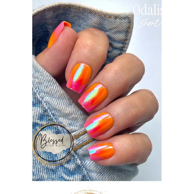 Private Island, Odalis short coffin press on nails come in a multicolor shiny finish with an ombre and holographic nail design.