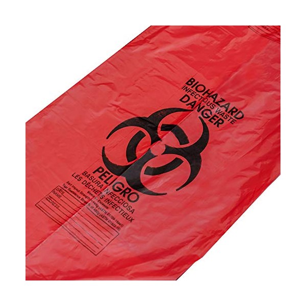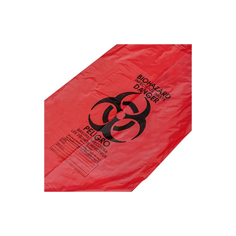 - The biohazard symbol and Infectious Waste is printed in English and Spanish on red biohazard waste liners.