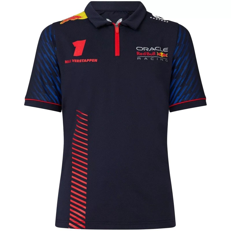 Perfect everyday wear for the younger motorsport fan, the team polo is a must-have for the ultimate Red Bull F1 fan. Instantly recognizable with team sponsor logos on the front and Dynamic Bull graphic at the back.
