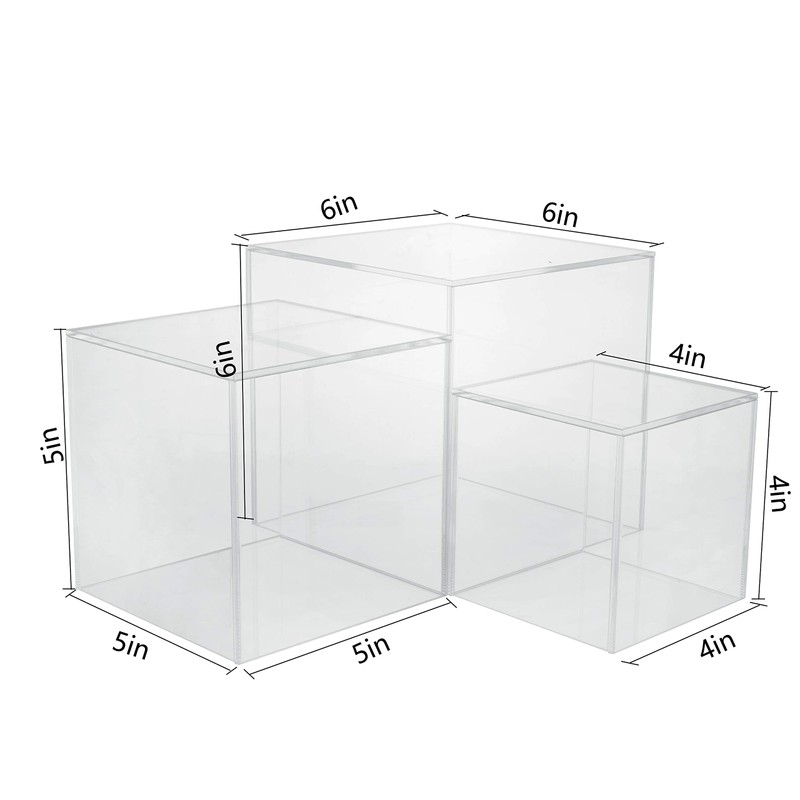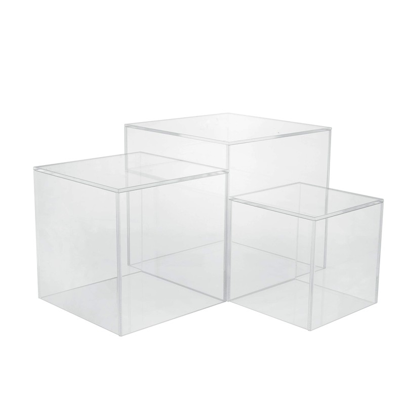 • Acrylic riser cubes are nesting and stackable, with hollow bottoms