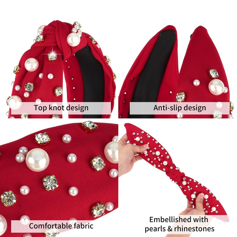 Red Headband Pearl Knotted Headband Sparkly Rhinestone Pearls Top Knotted Headband Womens Fashion Hair Accessories Cute Hair Bands
