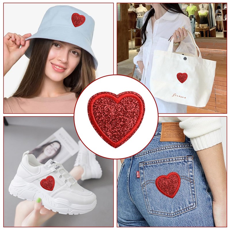 - Vivid Design The classic heart shape design makes it look more unique. The heart shaped iron on patches can be easily combined with different colours and clothing styles, adding sparkling effect to your clothes and make them more fashionable.