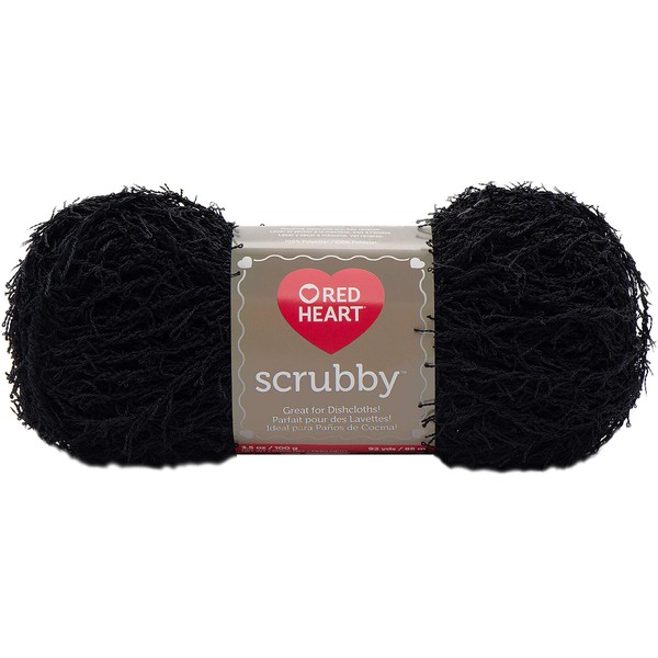 Just like the "scrubby" name implies, this uniquely textured RED HEART yarn is great for knit or crochet dishcloths and washcloths. This yarn can clean dirty pots easier than cotton yarn dishcloths, and since it is made from polyester, it will dry much quicker than cotton. This is a size 4 medium weight 100percent polyester yarn. Scrubby solids measure 92 yards in length and are 3.5 oz. We recommend a size us i-9 crochet hook and a size us 8 knitting needle. Machine wash on warm, gentle cycle. Tumble dry low.