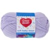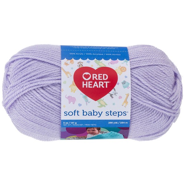 Red Heart soft baby steps yarn in fresh, no dye lot baby solids has an incredibly soft touch. Made of 100-percent acrylic medium worsted material. This collection works well for just about any project. It is available for 5 mm knitting needle and 5.5 mm crochet hook. These yarn has great wash ability. Fabric care instructions are machine wash, tumble dry, do not bleach, do not iron and dry cleanable. Made in Turkey. Available in lavender color. Measures 256-yards length.