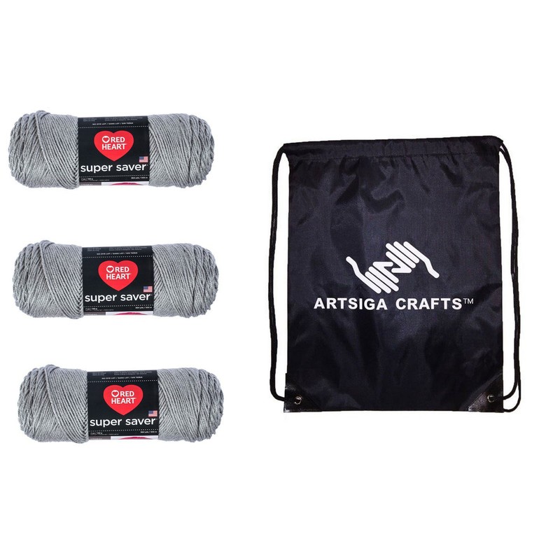 BUNDLE: Red Heart Super Saver Knitting Yarn Dusty Grey 3-Skein Factory Pack (Same Dyelot) E300-340 Bundled with 1 Artsiga Crafts Project Bag. DESCRIPTION: Red Heart Super Saver Yarn is a medium weight has been America's best selling yarn for over seventy years, perfect for all knit and crochet projects. WEIGHT CATEGORY: 4 Medium; Content Solids & Multi: 100% Acrylic ; Content Flecks: 96% Acrylic/4% other fibers; Put-up by Skein: Multi & Flecks: 5oz/141g 236yd/215m; Put-up by Skein: Solids: 7oz/198g 364yd/333m; Gauge: 17st x 23r = 4in/10cm on size US8/5mm knitting needles Suggested crochet hook size I9/5.5mm hook. DYELOTS: Skeins in the same Factory-Pack share the same dyelot, when buying multiple bags we try but are not always able to match dyelots; Care: machine wash, tumble dry, do not bleach, do not iron, dry cleanable; Made in USA. PROJECT BAG: Artsiga Project Bag measures 13 x 16 inches; includes a drawstring for easy closure and shoulder straps for easy carry-on and keeping projects on-the-go.