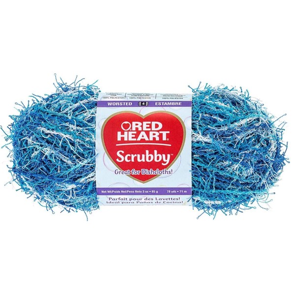 - Coats Yarn-Red Heart Scrubby Yarn. This textured yarn will make scrubbing dirty pots a lot easier than regular dishcloth cotton. Knit or crochet your way to clean. Weight category: 4. Content: 100% polyester. Solid Putup: 3. 5oz/100g, 92yds/85m. Multi Putup: 3oz/85g, 78yds/71m. Gauge: 16s x 21r = 4in/10cm on size US8/5mm knitting needles. Crochet: 13sc x 15r = 4in/10cm with size I- 9/5. 5mm crochet hook. Care: machine was cold gently cycle, tumble dry, do not bleach or iron, dry clean with P solvents only. Comes in a variety of colors. Each sold separately. Imported.