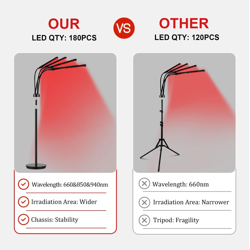 - LED RED LIGHT THERAPY FOR BODY: The 940 nm red light therapy device is equipped with an intelligent controller with a convenient timer function (10, 20 or 30 minutes), which helps you accurately control the time of each treatment and easily achieve the best effect. The red light therapy lamp stand is more stable and reliable than a traditional tripod, so you don't have to worry about tilting or falling