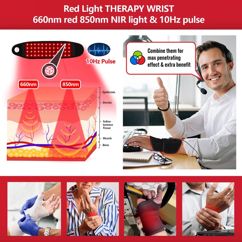 - 【WRIST HEATING PAD LED RED LIGHT THERAP WRIST WRAP】 96pcs 660nm red lights relieves hand wrist fatigue and pain, improves blood circulation, relax muscle. 96pcs 850nm Near-infrared lights with the strong ability to penetrate deep into tissues, ideal for wrist muscle and bone spurs recovery, reducing wrist joint inflammation and associated wrist pain.