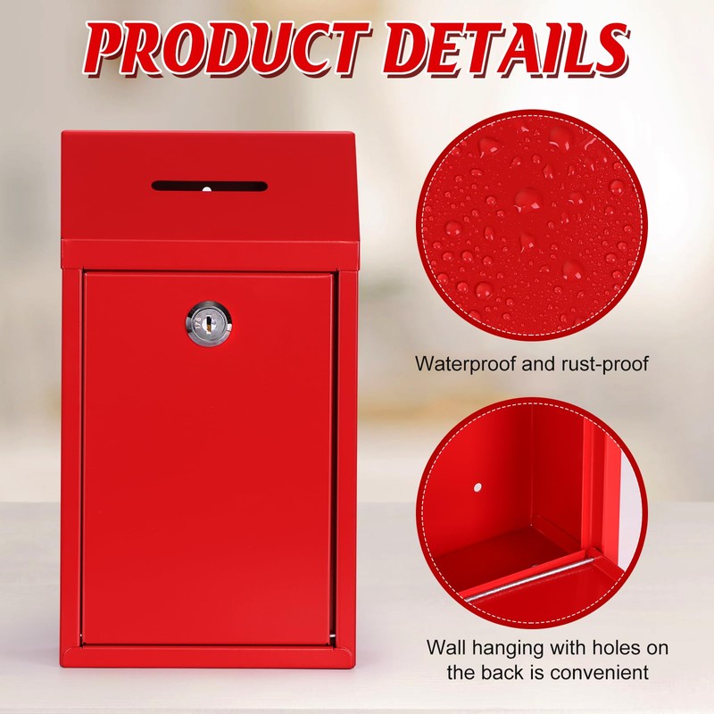 Red Metal Donation Box Collection Box Safe Suggestion Box with Lock Wall Mounted Mailbox Delivery Ballot Box Key Drop Box for Home Office Outdoor Door, 10.24 x 5.71 x 2.95 Inch