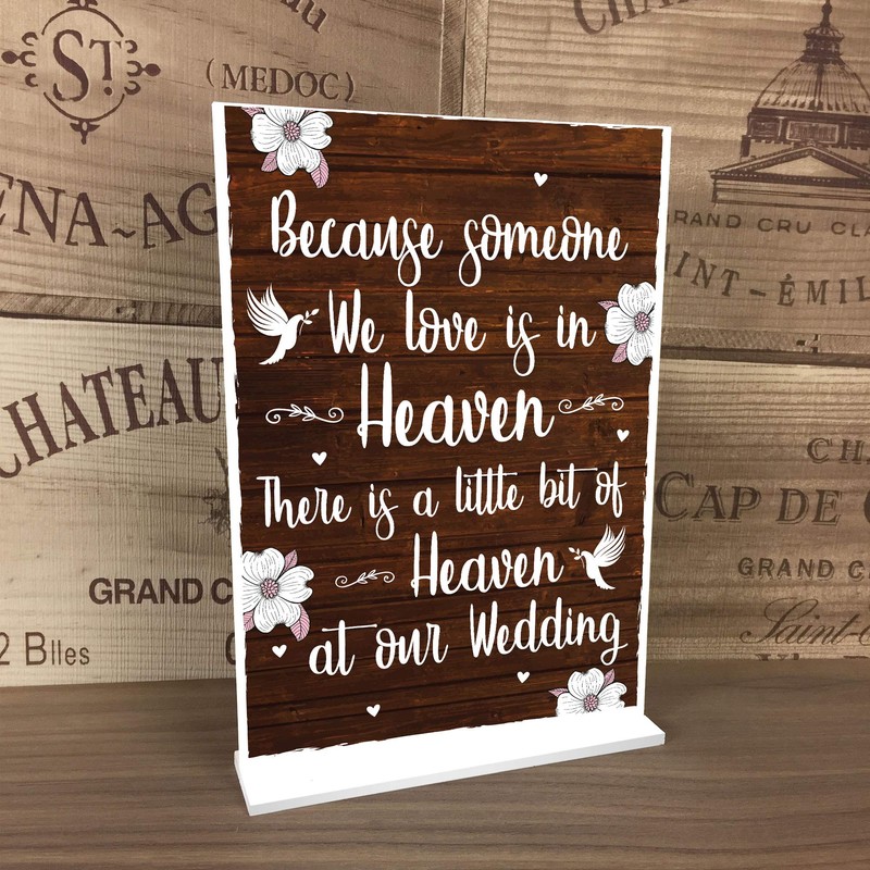 This plaque will look great standing on a shelf or in any part of the wedding. This Memorial Sign would fit perfectly into your wedding decoration to remember that someone (s) that aren't at your wedding! Perfect Wedding Table decoration! Remembrance Sign! Supplied with a stand, a beautiful keepsake that will be treasured for years to come.