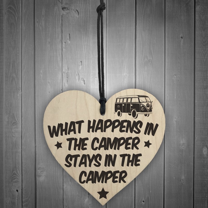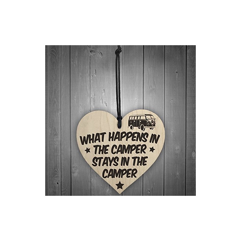 RED OCEAN What Happens In The Camper Stays In The Camper Novelty Wooden Hanging Heart Shaped Plaque Van Sign