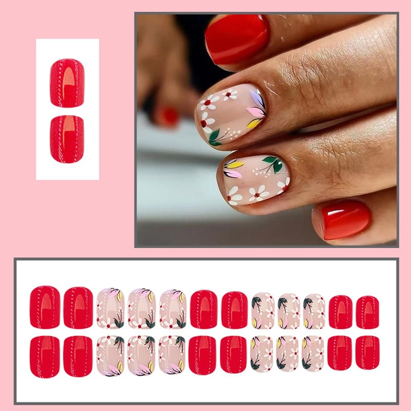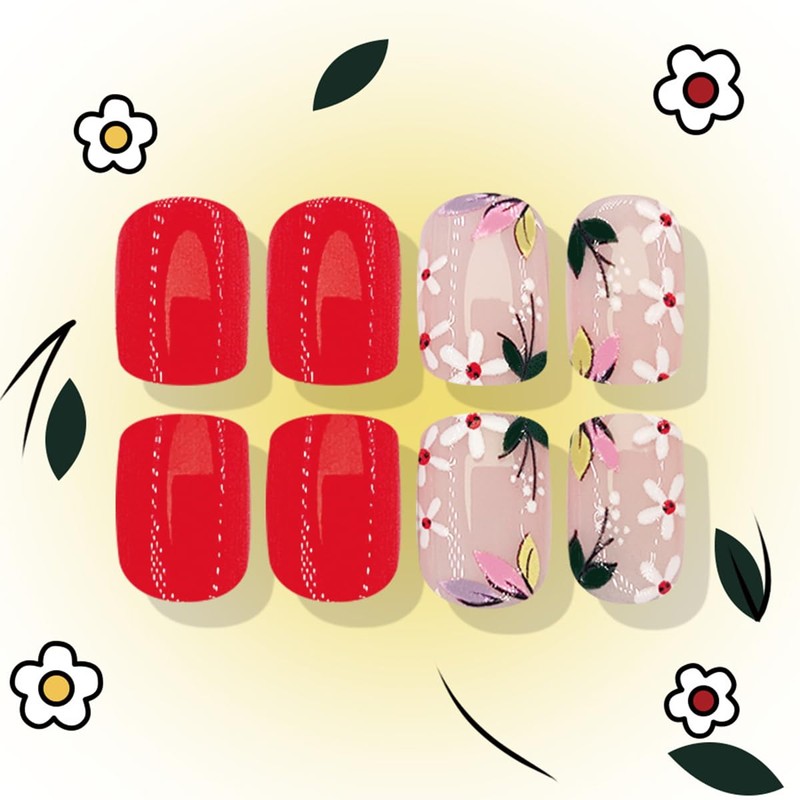 Red Press on Nails Extra Short Square Spring Summer Fake Nails with Small Wildflowers Design WLGDLH Nude False Nails Red Nails Gel Acrylic Nails Glossy Glue on Nails for Women 24Pcs
