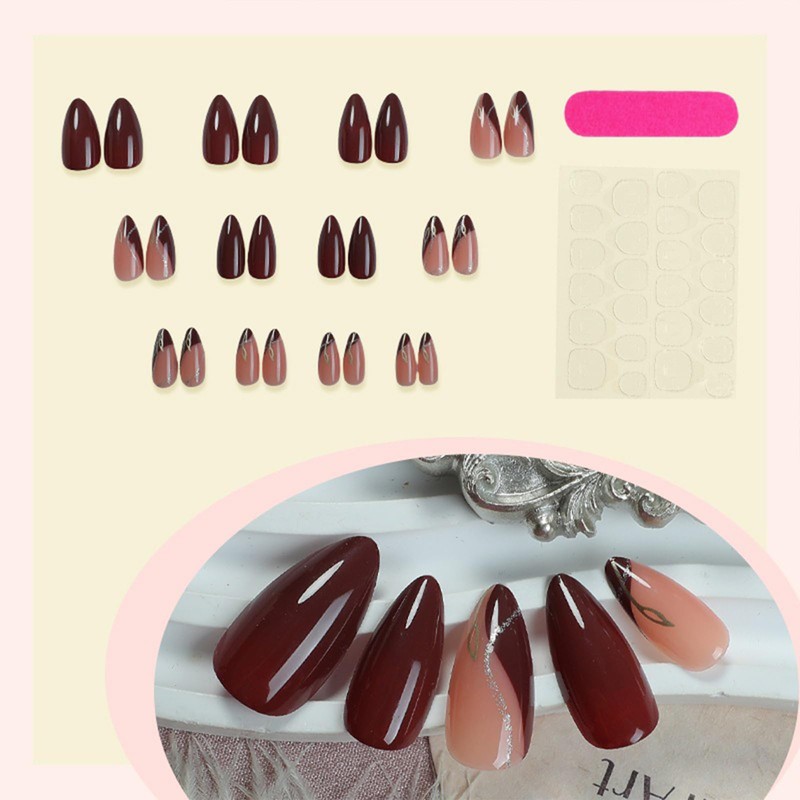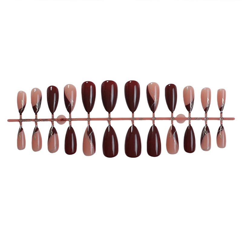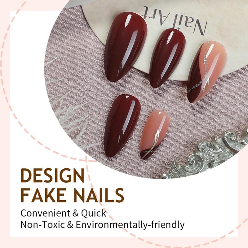 - 【Package Include】Comes with 24 wine-red almond acrylic false nails featuring elegant golden leaf patterns, 1 sheet of 24 jelly glues, 1 nail file, 1 wooden stick, and 1 alcohol pad—all for a seamless manicure