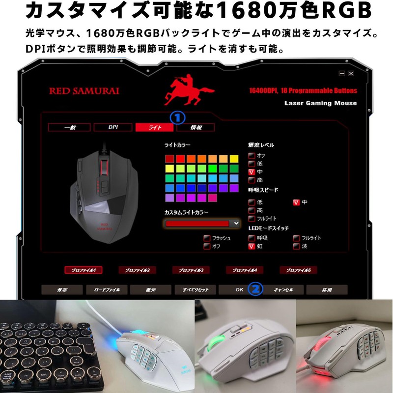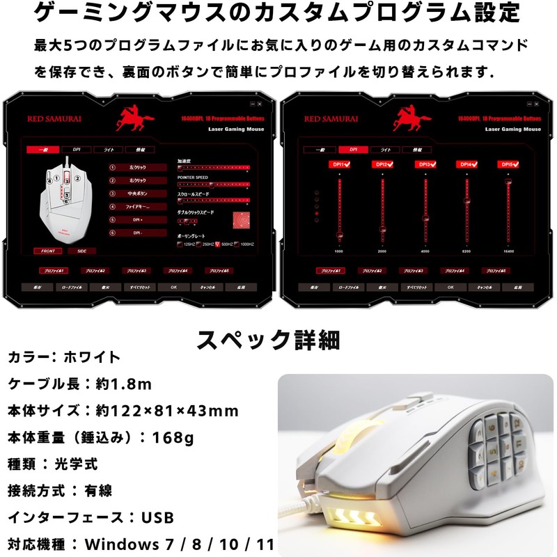 RED SAMURAI Gaming Mouse Wired Mouse 16400dpi 1000Hz 18pcs Program Button Side Button Weight Adjustment Stable Grip Backlight Customized Program MMO/FPS/MOBA Gaming Mouse (White)