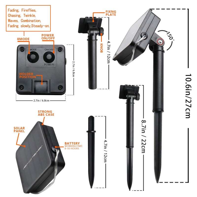 - 2 Switches & 8 Different Modes - The solar garden lights have On/Off button and Mode button, press mode button selects 8 different flashing modes to satisfy your diverse needs. Cute outdoor solar lights ideal for yard decorations.