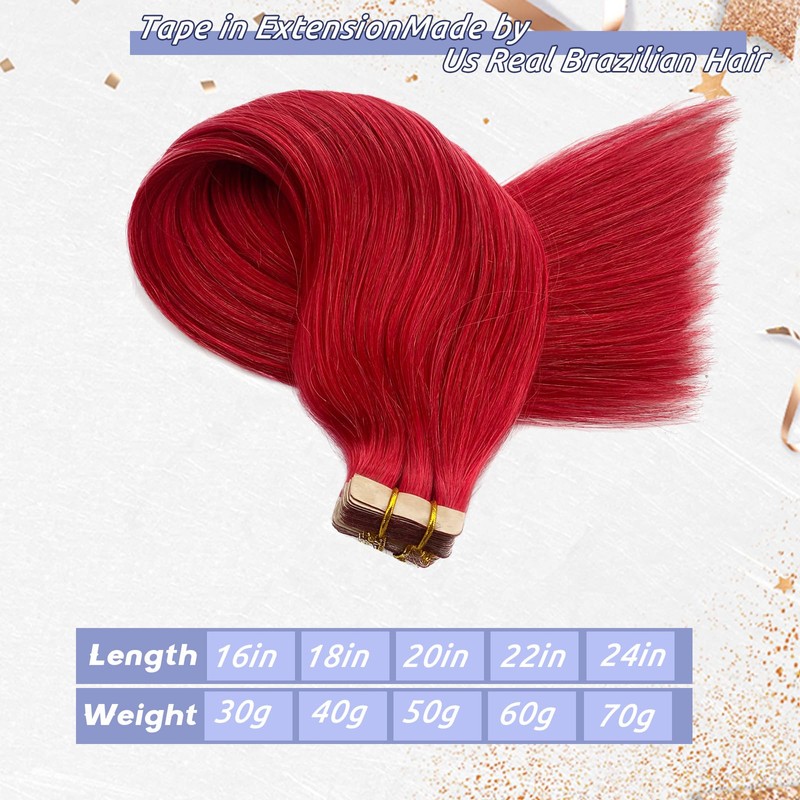 Red Tape in Human Hair Extensions,Skin Weft Tape in Hair Straight Real Hair Extensions Tape in 20PCS/30G Invisible Hair Extensions Hot Red 16Inch Tape in Extensions for Women