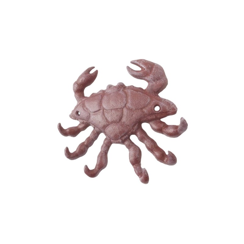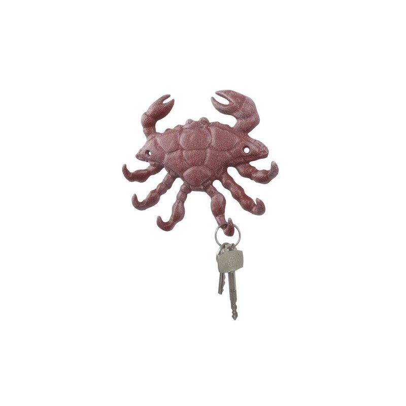 Red Whitewashed Cast Iron Decorative Crab with Six Metal Wall Hooks 7"