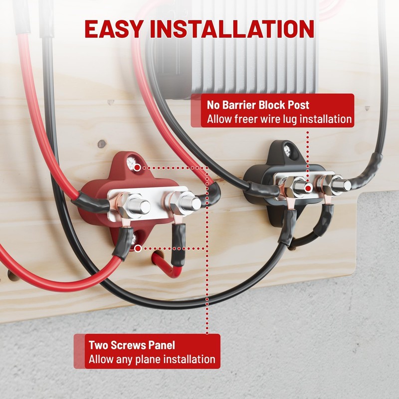 - Easy to Use: Include a red positive bus bar and a black negative junction post; Feature two screws panel for any flat surface install; Block post with no barrier allows freer wire lug installation; Recessed #10 mounting holes for more aesthetics