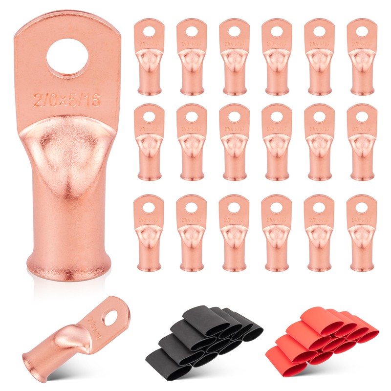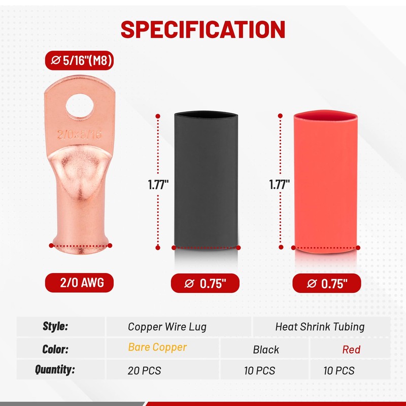 - Specification: Come with 20 PCS 2/0 awg 5/16"(M8) cable lug and 20 PCS 3:1 ratio heat shrink tubing (10 PCS RED and 10 PCS BLACK)