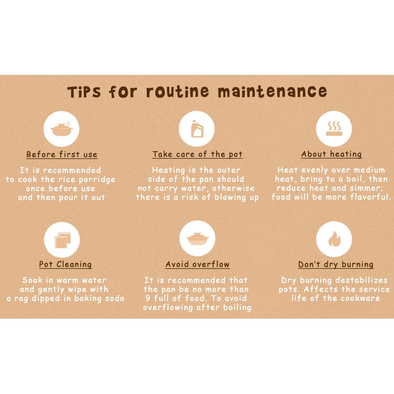 - Tips for routine maintenance: *1.Before first use- It is recommended to cook the rice porridge once before use and then pour it out *2.Take care of the pot- Heating is the outer side of the pan should not carry water, otherwise there is a risk of blowing up *3.About heating- Heat evenly over mediumheat, bring to a boil, thenreduce heat and simmer; food will be more flavorful. *4.Pot Cleaning- Soak in warm water and gently wipe with a rag dipped in baking soda. *5.Avoid overflow- It is recommended that the pan be no more than 9 full of food. To avoid overflowing after boiling *6.Don't dry burning- Dry burning destabilizes pots. Affects the service life of the cookware