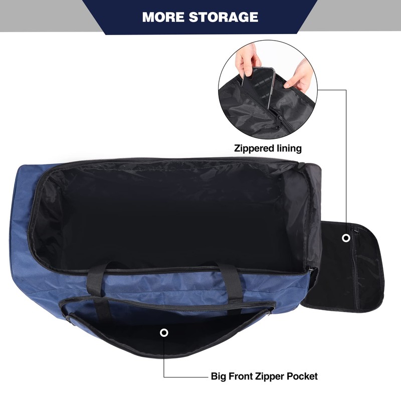 - More Storage: There is a big pocket with 2-way zipper at the front of the foldable wheeled duffle bag, so you can store some small items that you need to take frequently. It is also a compartment for dirty clothes, which is more convenient.