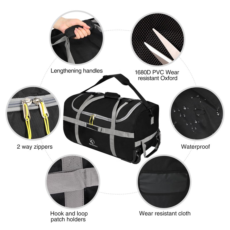 - Durable: Rolling Duffel Bag is made of high density water & tear resistant 1680D Oxford and 210D polyester. Reinforced stress points for durability. Large U-shaped zippered opening with 2-way zipper for easy packing.