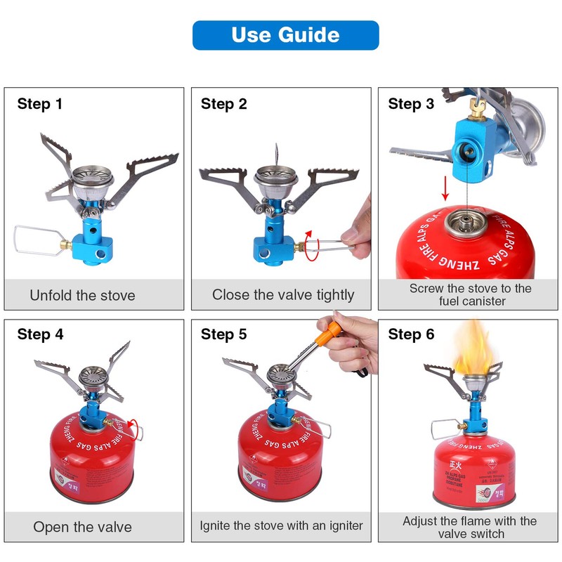 • Use Guide: First unfold the stove and close the valve, then screw the stove to the fuel canister and open the valve, lgnite the stove with the igniter, and adjust the flame with the valve switch