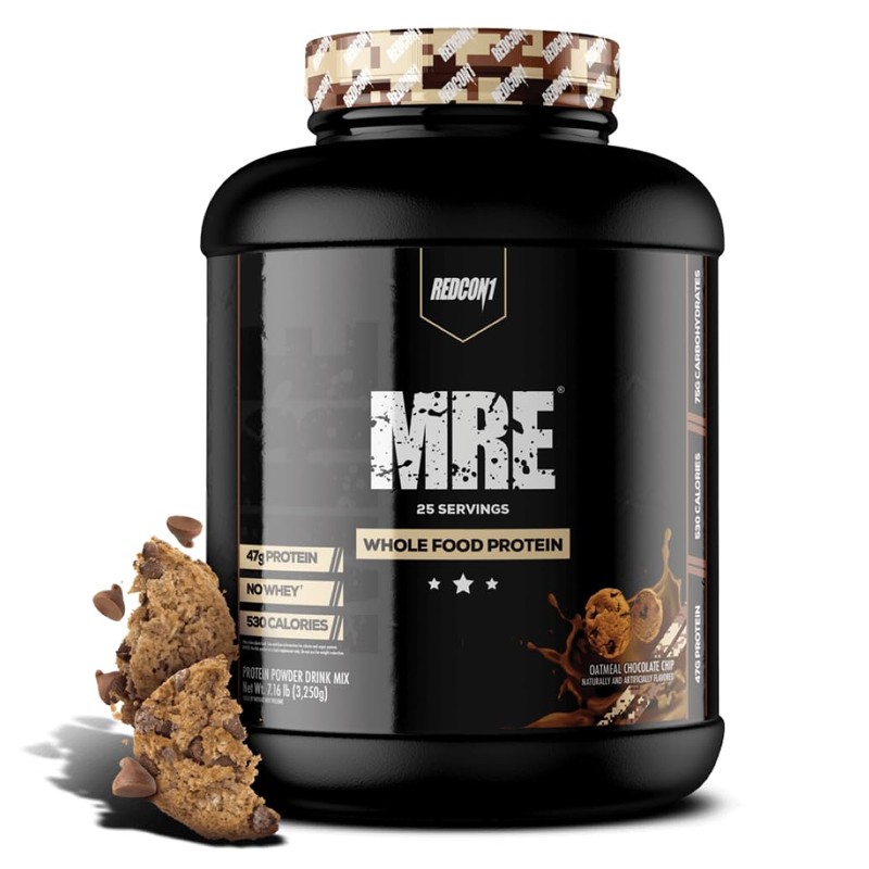 - Professional Grade Formula - REDCON1's MRE protein powders contain a whole food high protein blend of beef, salmon, chicken, egg, brown rice and pea protein powders. Each meal replacement protein powder shake is 530 calories with 47g of protein and only 5g of sugar in your new favorite meal replacement powder.