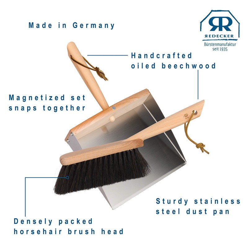 Redecker Horsehair Hand Brush and Dust Pan Set with Oiled Beechwood Handles with Magnet, 14-1/8-Inches