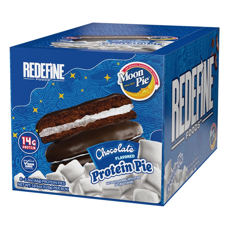 - PROTEIN PIE - Inspired by MoonPie, Redefine Foods Protein Pie is a coated, non-GMO sensation. It's two chewy cookies, marshmallow filling, and irresistible chocolate in a powerful protein snack!
