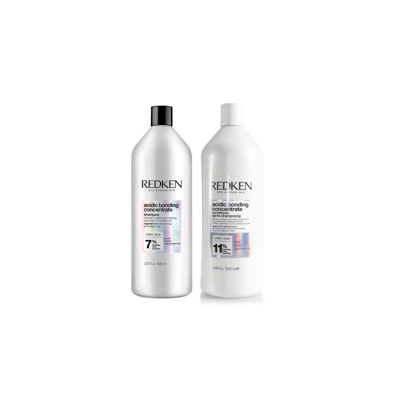 The Redken Acidic Bonding 1L Shampoo and Conditioner Bundle includes the Redken Acidic Bonding Concentrate Shampoo and Conditioner, formulated to repair the bonds in damaged hair for stronger, healthier hair with reduced breakage and split ends, plus a smoother feel.