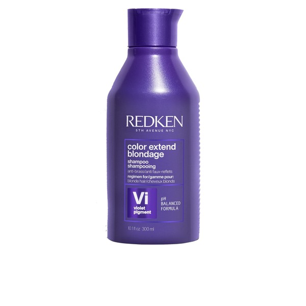 Redken Color Extend Blondage Color Depositing Purple Shampoo 300ml is a color-depositing purple shampoo that strengthens and repairs blonde hair from the core while removing unwanted brassiness and leaving blonde hair color cool and bright.