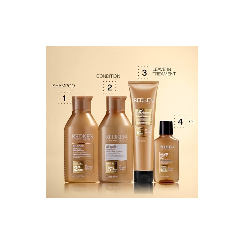 Redken All Soft Hair Conditioner with Redken's Moisture Complex with Argan Oil to detangle, moisturize, soften, and add shine to dry, brittle hair. This conditioner leaves hair silky soft with increased manageability, suppleness and shine. This professional product provides 15x more conditioning when used with All Soft Shampoo and Argan-6 oil