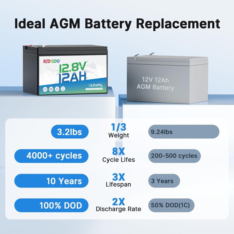 - Ultra-Light & Compact: Only 3.2lbs (1/3 weight of lead-acid) with the same size as 12V9Ah agm batteries but triple the energy (153.6Wh vs 54Wh). Easy to carry for camping, marine, or emergencies.