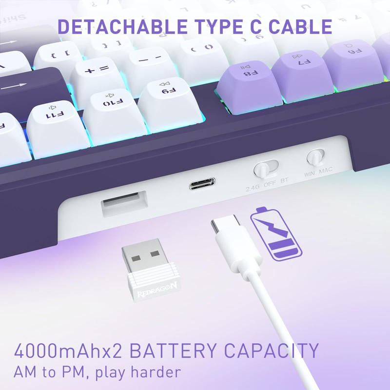 • 3-Mode Connection - Geared with Redragon advanced tri-mode connection technology, USB-C wired, BT 3.0/5.0 & 2.4Ghz wireless modes which make the user experience upgraded to another level in all fields