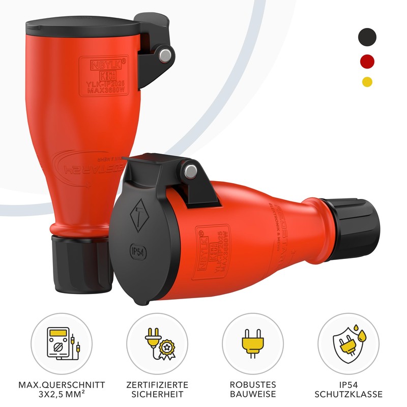 RedStar24 Schuko Coupling 230 V IP54 Set of 2 Robust Sockets, 3-Pin, Rubber & Plastic, Black Red, Automatic Spring Cover, One-Handed Operation, Ideal Outdoor Applications