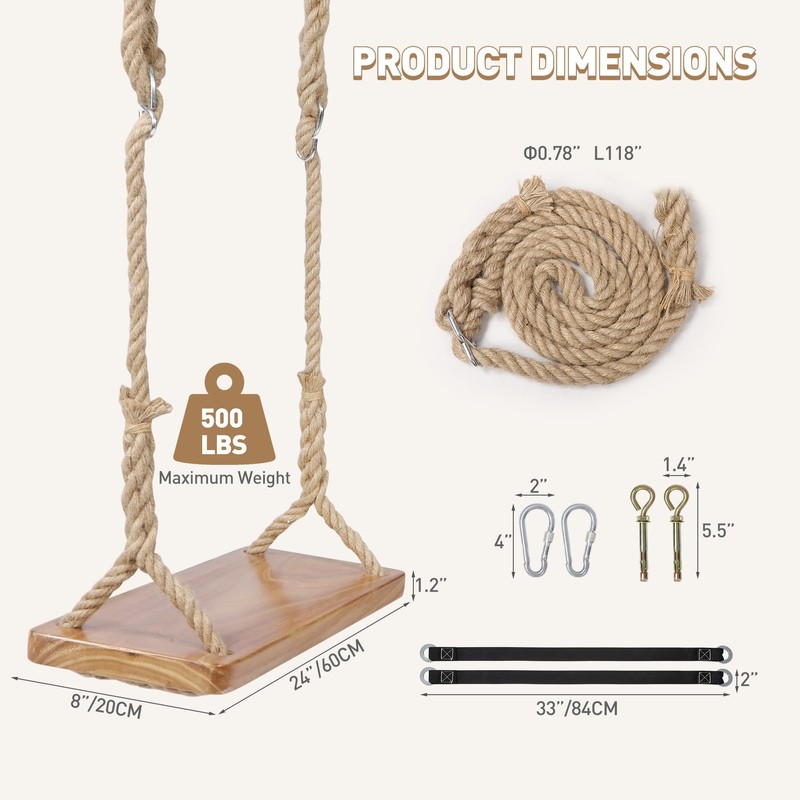 - Sturdy Material: This wood swing seat is made of high-quality Elm wood, featuring exceptional durability and natural textures. The load-bearing capacity is up to 500lbs. Smooth surface with round corner. No sharp edges.