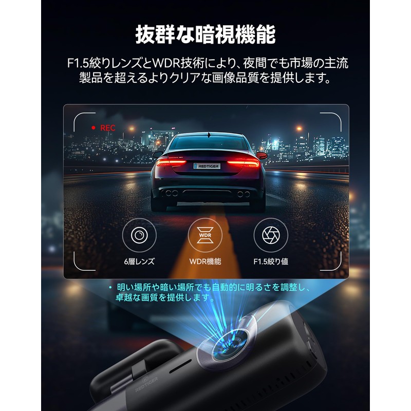 - [F1.5 Ultra Large Aperture Lens and Outstanding Night Vision] The front camera is equipped with a micro lens with 6-layer special processing (F1.5), which can gain more exposure and brightness under the same lighting conditions. The images and videos recorded in low light such as at night are also very clear. Great night vision performance allows you to record incredibly detailed footage day and night. Built-in imaging technology, effectively reduce image noise and record everything clearly. The WDR/HDR image processing technology on the front and rear of the F9 drive recorder provides a balanced calibration for the glare and backlight when driving at night, and it reduces the problem of "white over" and "blackout" and other problems, resulting in clearer, brighter and more detailed images
