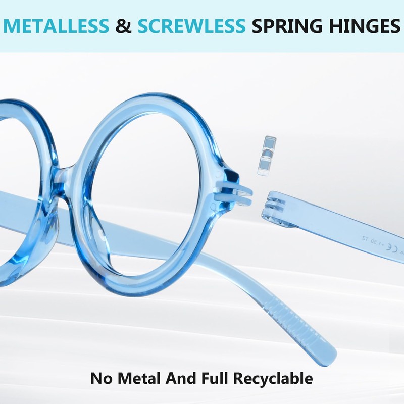 - These huge round reading glasses are durable. The metalless and screwless design avoids the problem of screws falling out and hinges damaged, allowing you to wear them for long periods of time without worrying about the arms breaking.