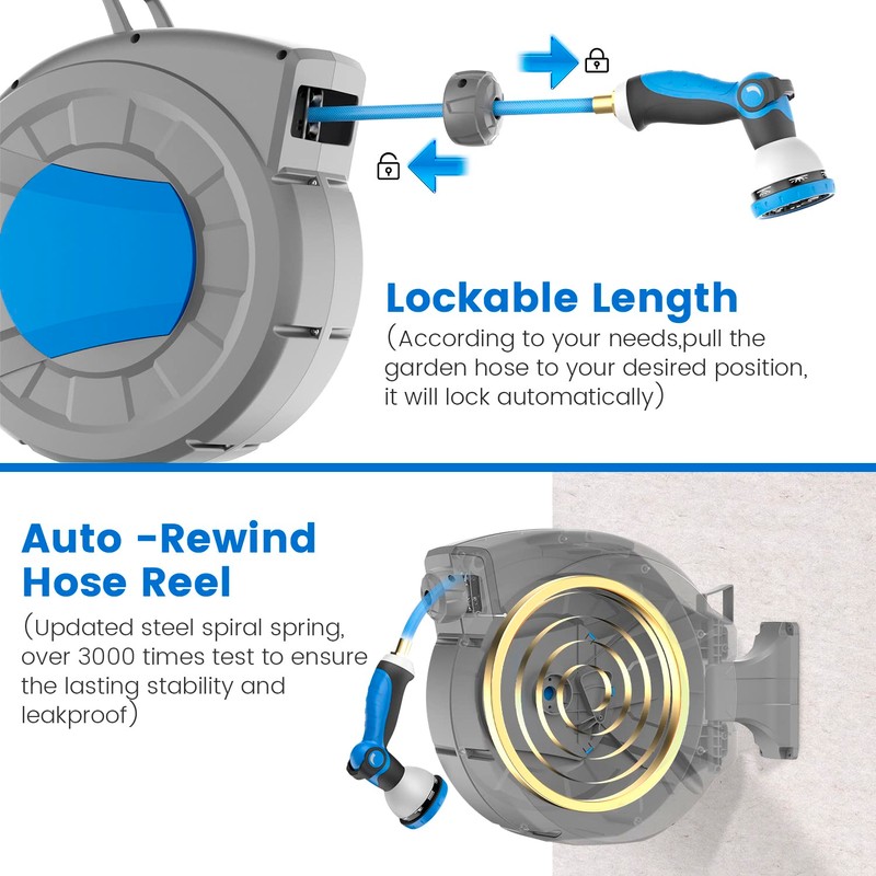 - 【Auto-Rewind &Kink Resistant 】After use, only need to gently pull the hose reel outward to activate the automatic recovery mechanism, the hose will be automatically recovered slowly and automatically arranged in the interior, to ensure tidiness, with no more worrying about knots.