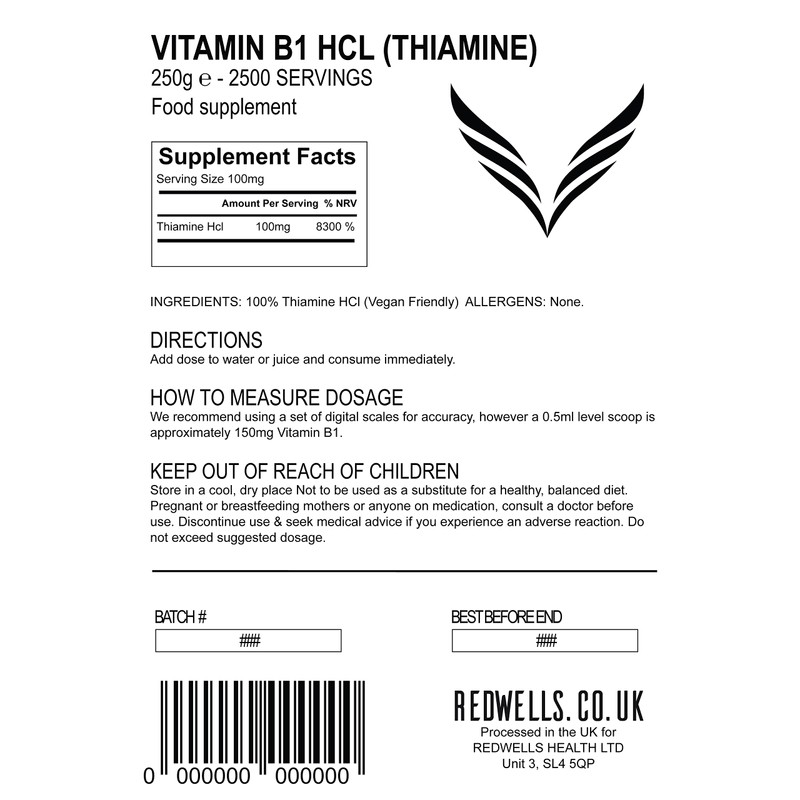 Product descriptionWhat is Vitamin B1?Vitamin B1 or Thiamine is a water soluble organosulfur compound part of the Vitamin B complex family of substances which play an essential role in metabolism. Vitamin B1 is important for the body, helping to maintain normal heart function, assists with overcoming metabolic disorders and psychological function.Food containing Thiamine include wholegrain bread, oats, green peas and egg.Our Vitamin B1 powder has been manufactured to British, United States and European Pharmacopoeia standards and is suitable for vegetarians and vegan.Benefits of Thiamine Vitamin B1 powder 100% Pure Vitamin B1 Hcl. Essential B Vitamin. Pharmaceutical Grade. Vegetarian and Vegan Friendly.About REDWELLSWe are a leading nutritional supplement brand, supplying a range of premium products throughout the UK and the rest of the world.We believe customers deserve full transparency.We source our raw ingredients directly from manufacturers who hold accreditations such as ISO 9001, ISO 14001 and ISO 22000. We ensure they have not been adulterated in any way, giving our customers the highest quality, premium supplements available.Ingredients100% Pure Vitamin B1 HCL PowderDirectionsTypically, when supplementing Thiamine a dose of 100mg is used for general health purposes, however this may be increased depending on the individual requirements.Safety WarningDo not exceed recommended daily dose. Store in a cool dry place away from direct sunlight and heat sources. Keep out of reach of children. Not intended for use by persons under the age of 18. Our supplements are not intended as a substitute for a varied diet and a healthy lifestyle. This product is not intended to diagnose, treat, cure or prevent and disease or illness. Discontinue use and consult your doctor if you experience any adverse reaction. If pregnant or breastfeeding, consult your physician before use.Legal DisclaimerNot for sale to persons under the age of 18. By placing an order for this product, you declare that you are 18 years of age or over. This item must be used responsibly and appropriately.Manufacturer Contact InformationREDWELLS HEALTH LTD, a UK Company, Registration Number 09097408