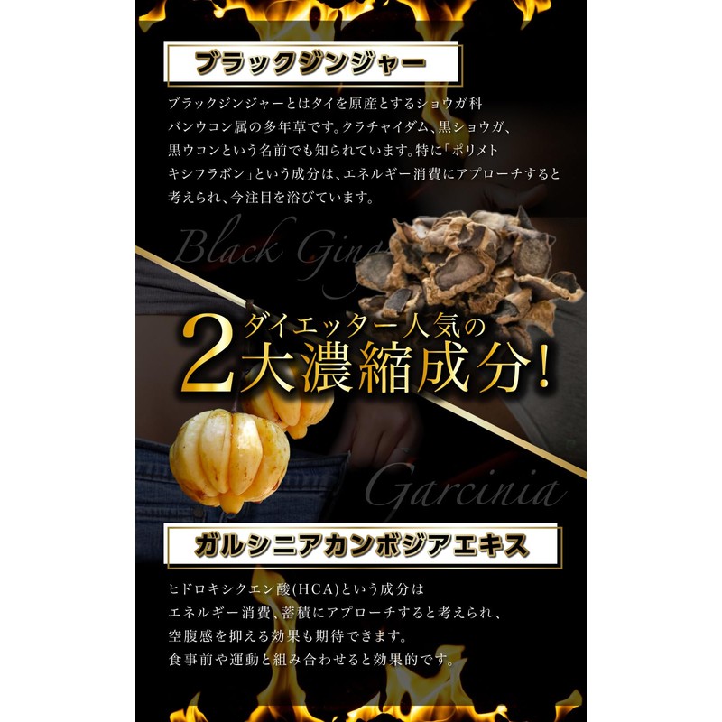 - ✅ 【2大成分とは】ブラックジンジャーは黒ウコンとも呼ばれ、ポリフェノールやアミノ酸も含有しています。ヒドロキシクエン酸(HCA)という成分はエネルギー消費にアプローチし、空腹感を抑える事が期待されています。