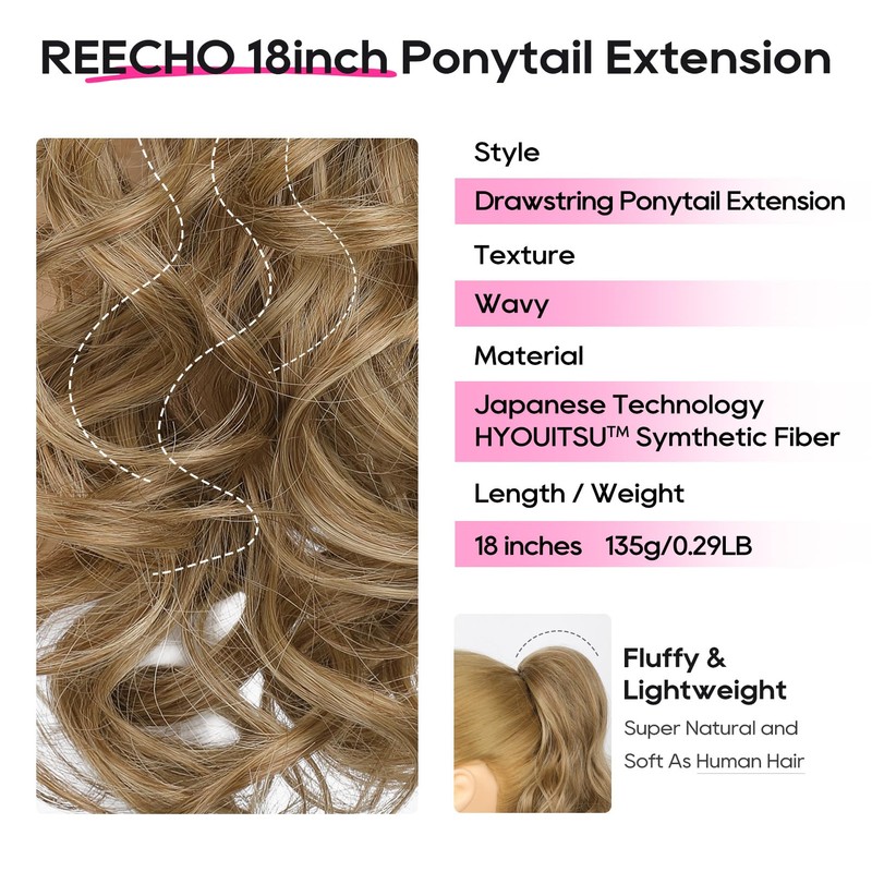 - 【All Occasions Suitable】REECHO 18inch ponytail extension gives you an instant ready hairstyle for daily and important occasions. You can put it on for a night out, shopping, live shows, birthday party, workout, wedding, Cosplay and more! Effortlessly get your perfect everyday wavy ponytail from REECHO